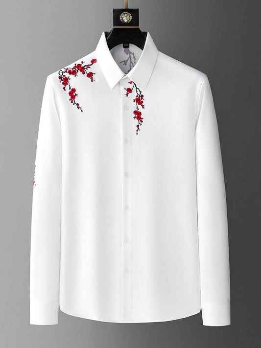 🌼 Classic white shirt with delicate floral embroidery in red and black. ✨ Soft, high-quality...