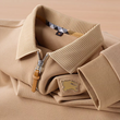- Collar Style: Ribbed spread collar with plaid inner lining